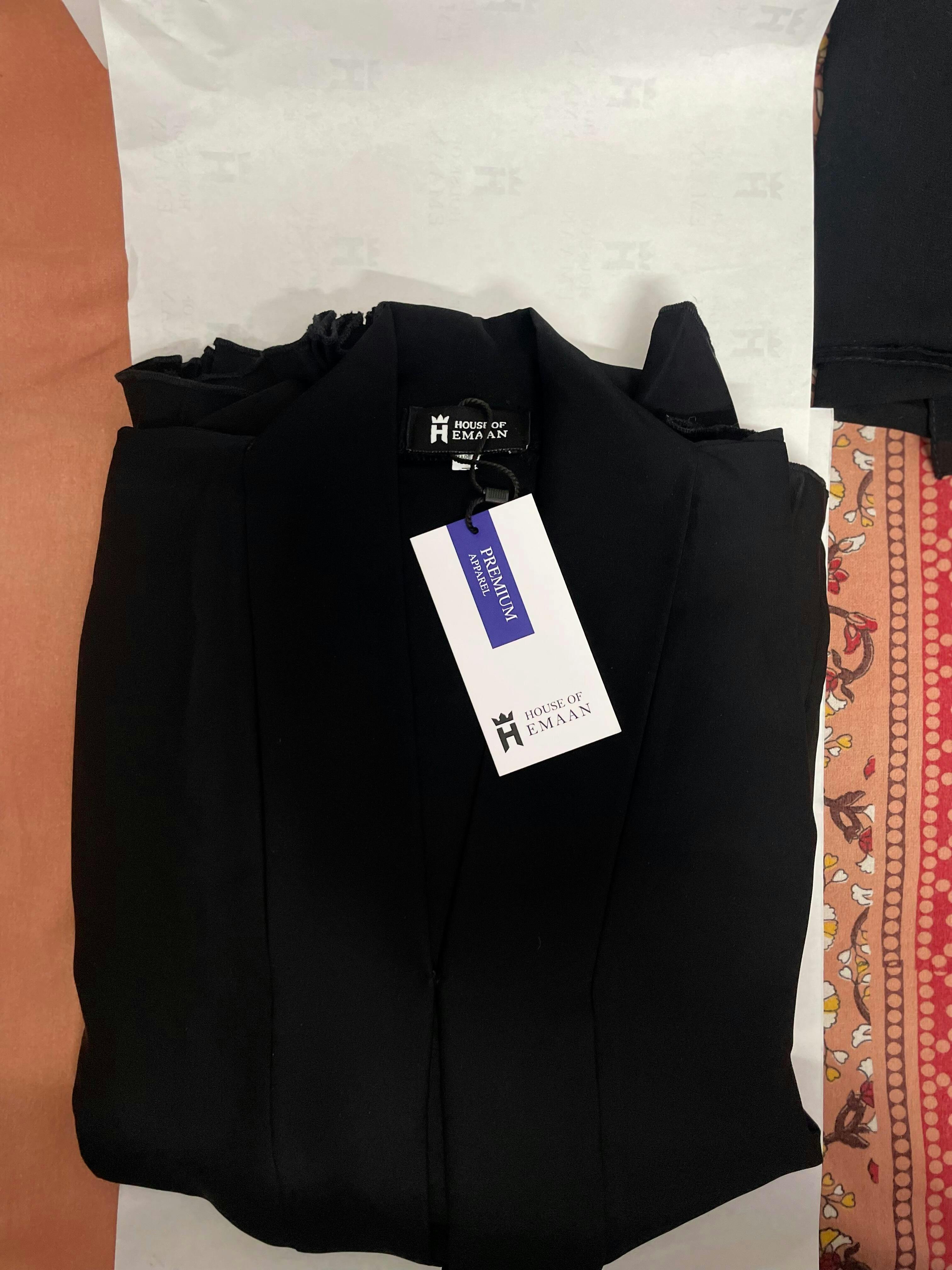 A modern open-front abaya designed with signature accordion pleats along the side and back panels, creating a fluid slit effect and graceful movement. Finished with a discreet neckline hook closure and tailored full-length sleeves, this piece balances structure with elegant flow.